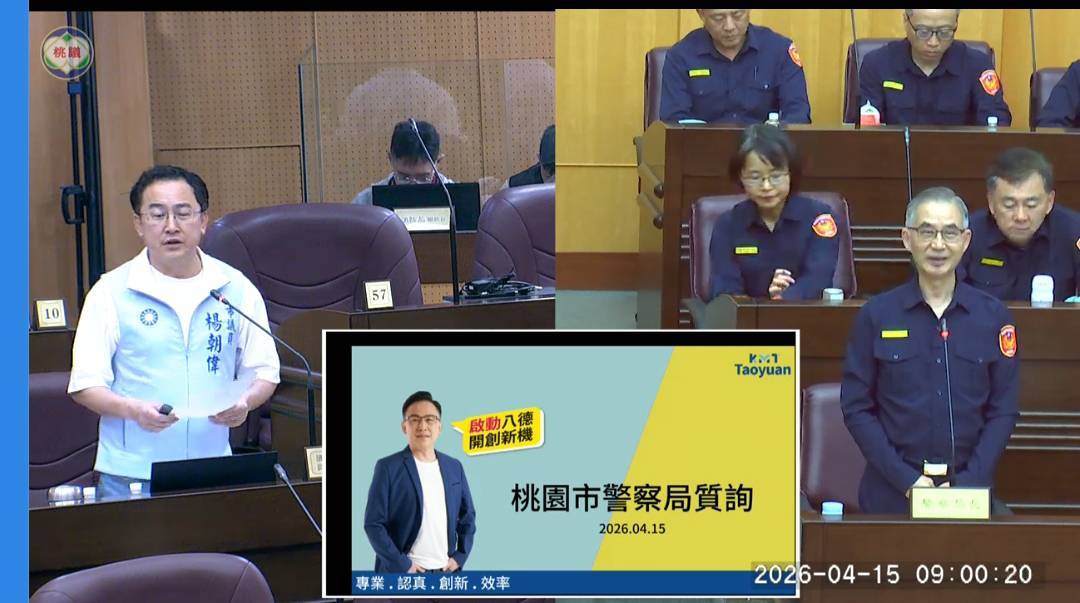 桃園市議員楊朝偉於議會質詢時指出,桃園市110報案量較去年增加逾5萬件,成長幅度接近一成,顯示基層警力勤務負擔持續攀升。他形容,第一線員警幾乎成為「24小時全能保母」,無論大小案件,民眾皆仰賴警方即時處理,導致勤務壓力日益沉重。