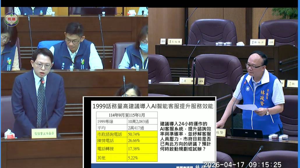 林政賢認為,在人力有限情況下,市府應加速導入24小時AI客服系統,以提升服務效率與準確性,同時減輕第一線話務人員負擔。他質疑,目前各縣市皆積極導入AI應用,桃園進度卻仍停留在評估階段,要求市府明確提出時程規劃。