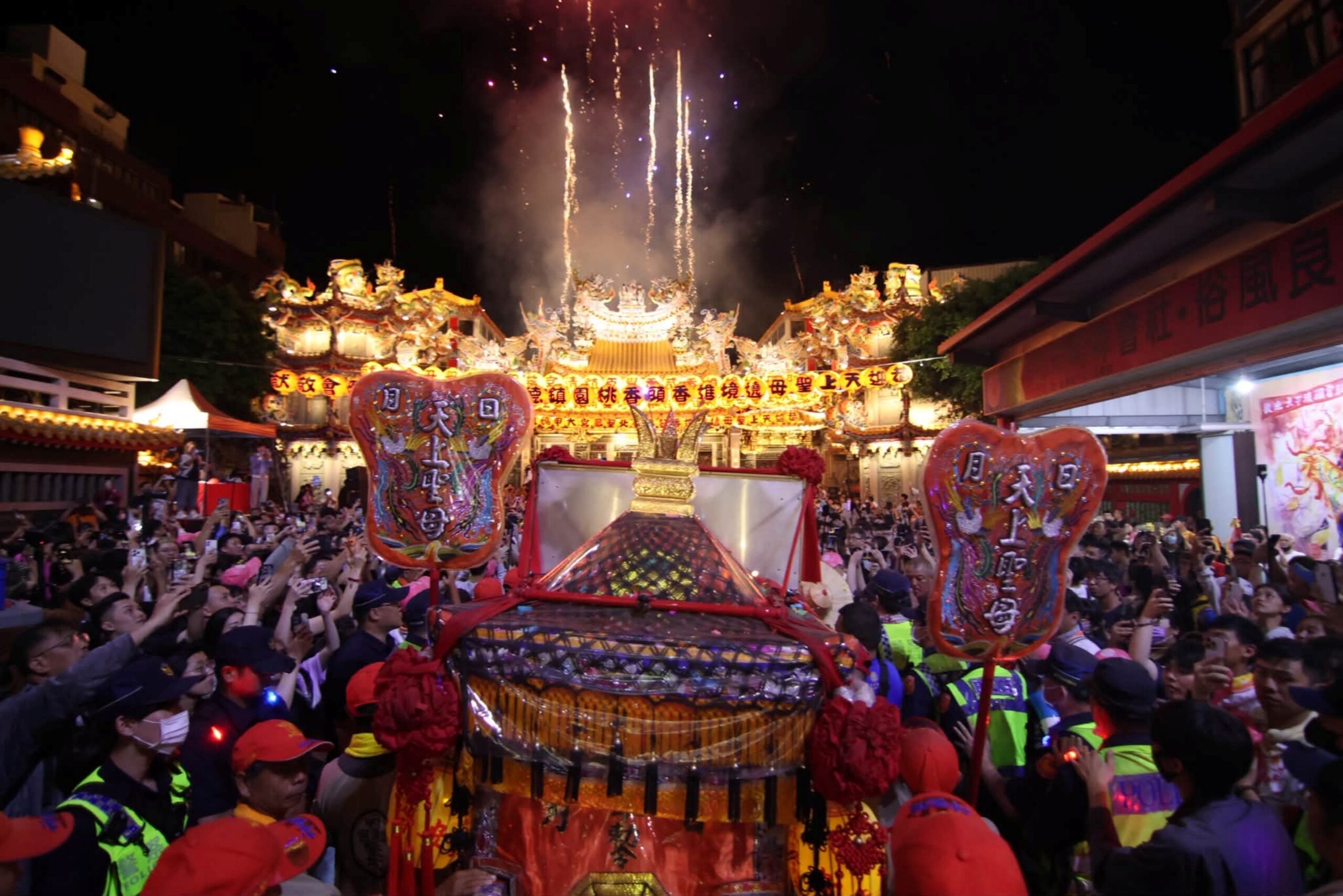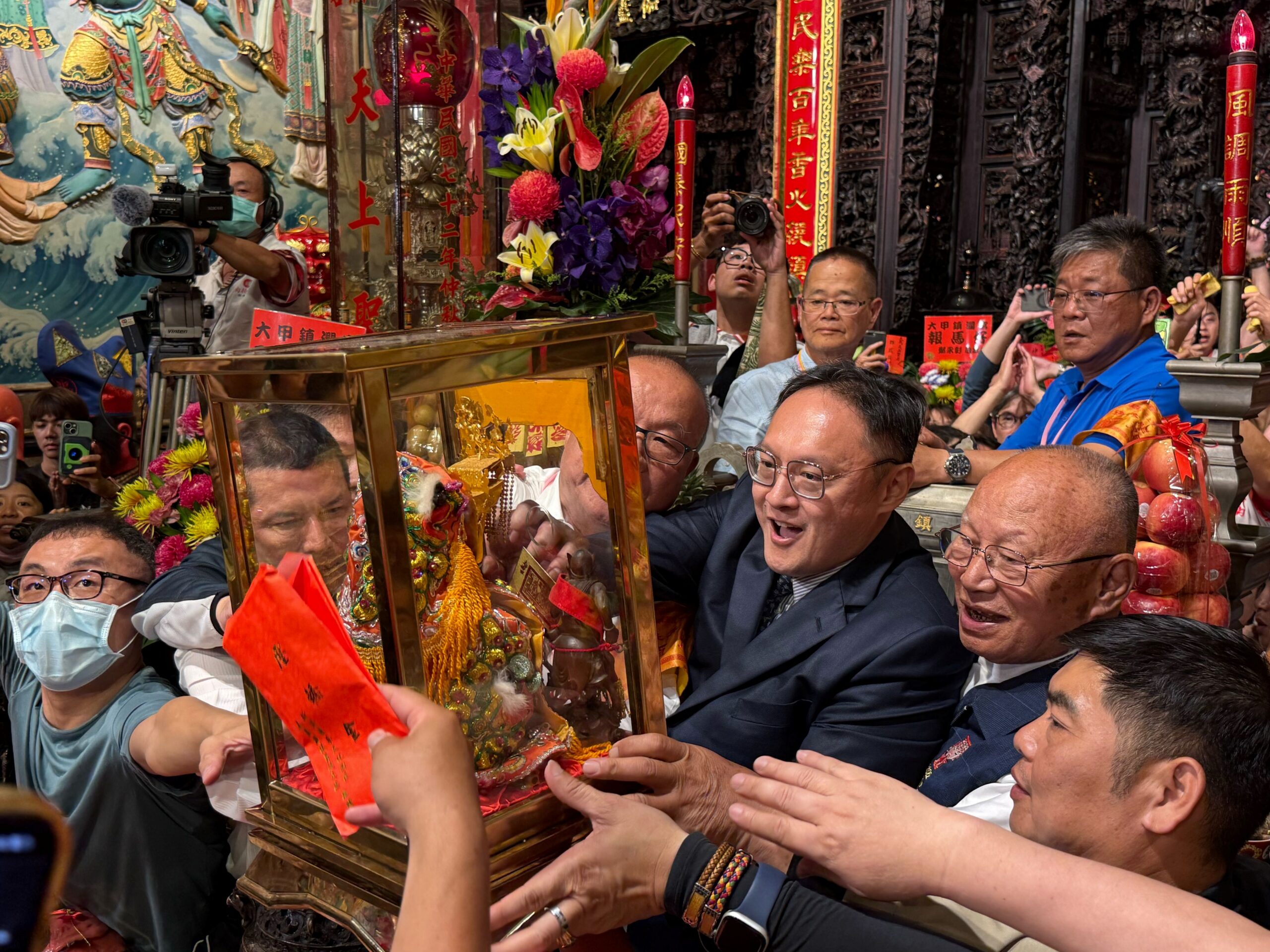 昨晚鎮瀾宮廟前廣場人山人海,大批信眾翹首迎候大甲媽回鑾。在報馬仔、開路鼓、三十六執士團及今年新成立的「二十八星宿燈籠隊」等駕前團隊護持下,媽祖鑾轎於凌晨1時21分返抵鎮瀾宮廟埕,絢麗煙火點亮大甲夜空,神轎班踩著大小禮步將神轎迎入正殿前,鎮瀾宮董事長顏清標、副董事長鄭銘坤依序恭請湄洲媽、副爐媽、正爐媽等神像出轎,信眾齊喊「進喔!進喔!」接力恭迎媽祖安座,場面莊嚴震撼,也為沿途平安庇佑虔心叩謝。