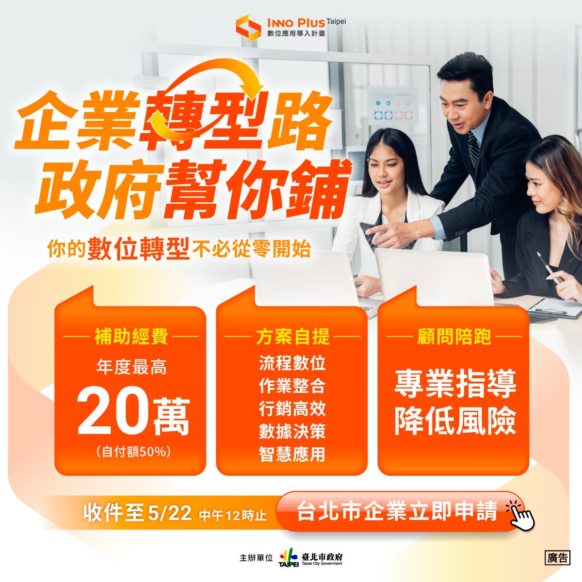 隨著數位應用快速發展,企業導入工具並落實應用,已成為提升營運效率與競爭力之關鍵。為協助企業突破轉型困境,臺北市政府產業發展局持續推動「臺北市中小企業數位轉型導入計畫」,提供最高新臺幣20萬元輔導經費,結合顧問陪跑機制,協助企業加速數位應用落地。今年亦特別針對受美國關稅政策影響企業,提供10家保障名額,強化企業營運調整能力,歡迎本市企業踴躍提案。