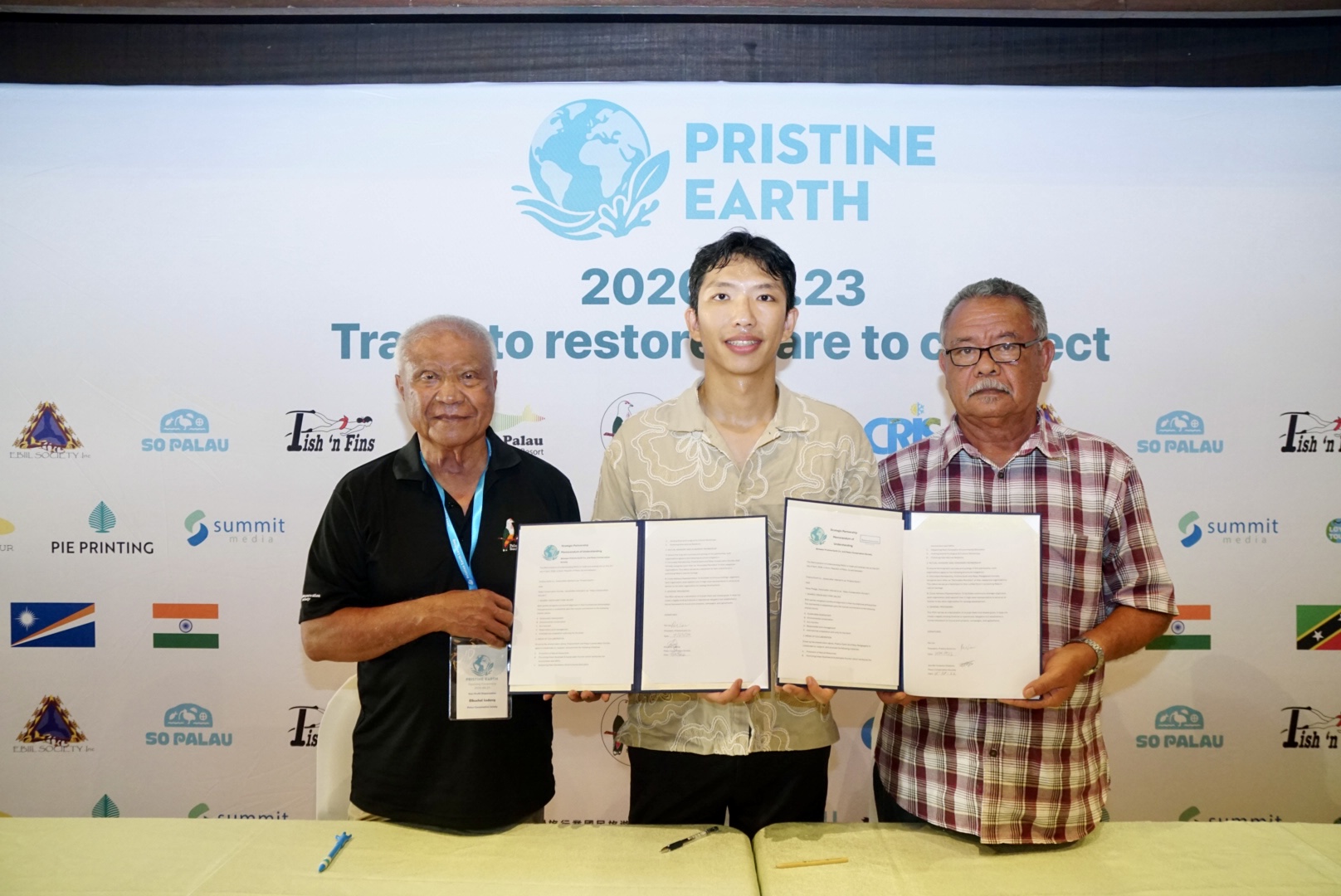 圖:Pristine-Earth會長Pai-Chen(中)與帛琉保育協會執行長Elbuchel-Sadang(左)以及帛琉誓詞主席Demei-Obakrairur(右)共同簽署合作文件,推動再生旅遊與在地保育行動。(帛琉薈萃集團提供)
