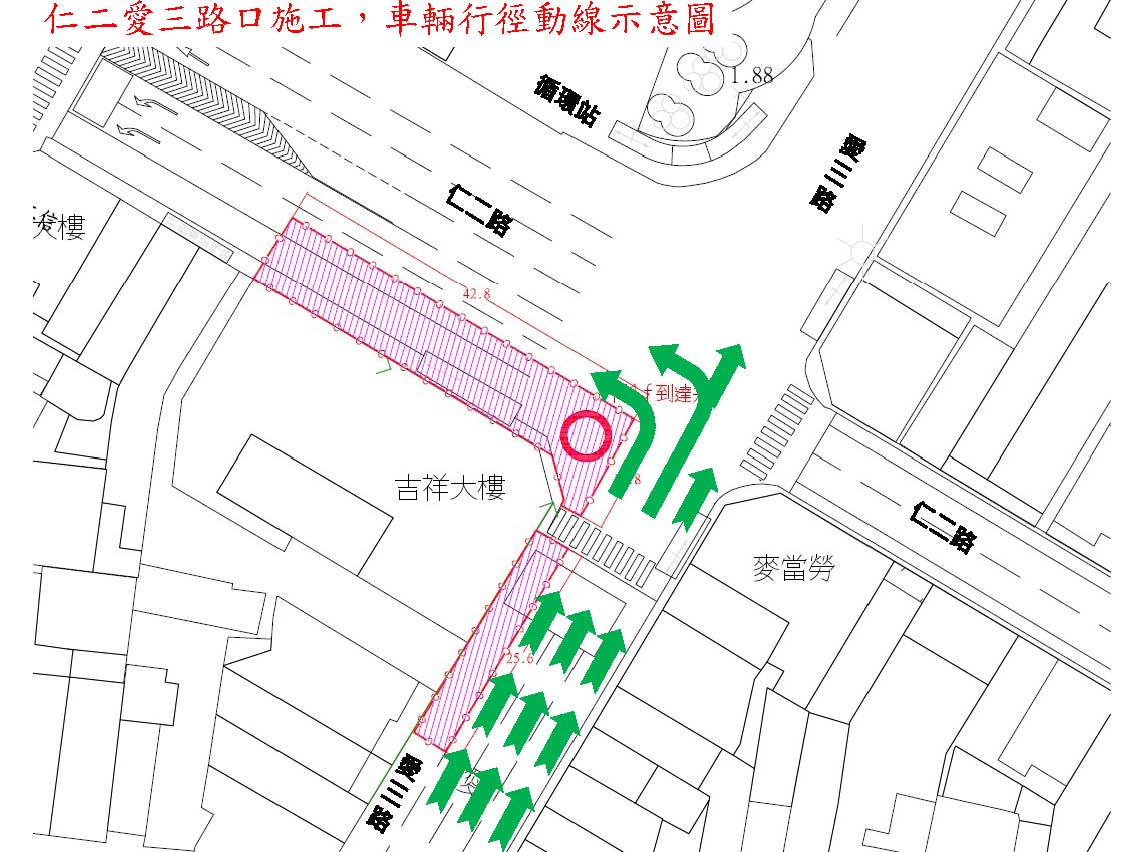 微風東岸商場前方(循環站)施工處將與愛三路口同時施工,預計115年5月完成。期間將調整現有行車動線,採不縮減車道,維持3車道繞行工區方式,降低對交通衝擊。工務處將依照交通維持計畫之規定配置義交協助疏導交通,並請行經該路段時務必減速慢行。