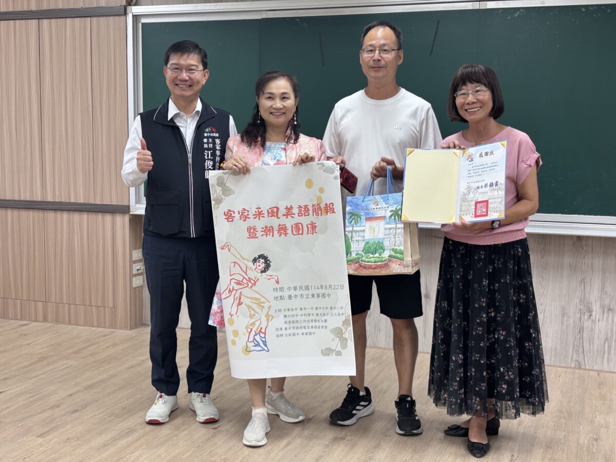 為推動客家文化向下扎根並與國際接軌,台中市各高中客家采風教育服務工作坊舉辦「客家采風美語簡報暨潮舞團康」活動,昨(22)日下午於東勢區東華國中舉行,由台中市北新國中林慧娟校長和黃江圳老師帶領,集結全市8所高中33名學員,攜手東華國中15位學生,共同完成一場別開生面的文化饗宴。台中市府客委會主委江俊龍受邀參加並頒發感謝狀,另致贈客委會出版最新一期「聽看台中客半年刊」,肯定青年學子以創意、美語與熱情投入偏鄉教育及公益服務,展現新世代傳承客家文化的能量。