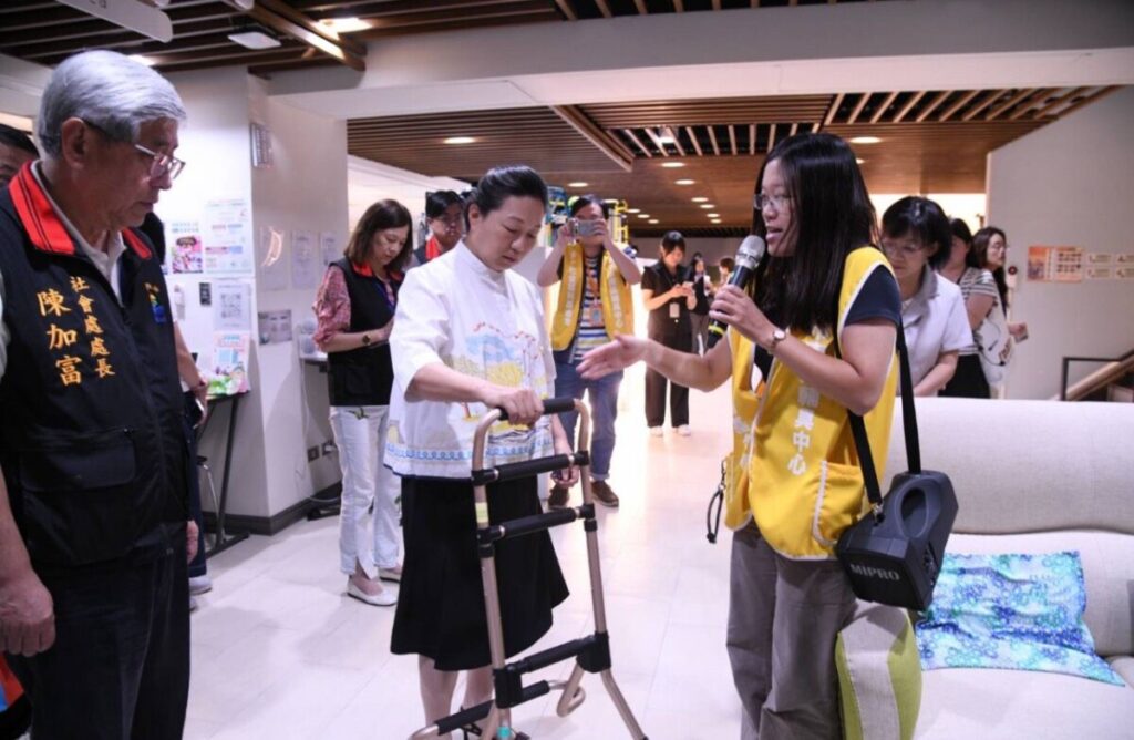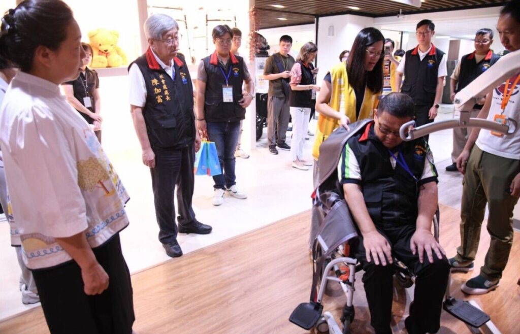 在輔具中心,縣府團隊實際體驗輔具展示區、障礙路面體驗區及居家情境區。中心設計包含可調整高度的馬桶與扶手,協助長輩輕鬆起身;護理電動床透過角度調整,讓長者安全轉換姿勢;並有移位輔具協助長者從床上順利移至輪椅。