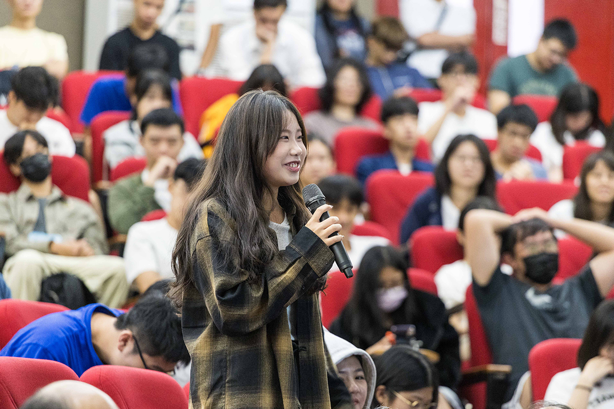 在互動環節中,有老師詢問新技術如何突破法規限制。施振榮以他近期推動的高空風能發電為例說明,許多創新往往先於法規,他整合企業能量共同開發,目前已建立示範場,不僅降低成本,還能擴大成果。也有學生請益面對困境如何反向思考,他回應:「困境之所以存在,就是因為原來的思維解決不了問題,反向思考不是180度轉彎,而是要嘗試不同方法,不斷試驗,終能突破瓶頸。」