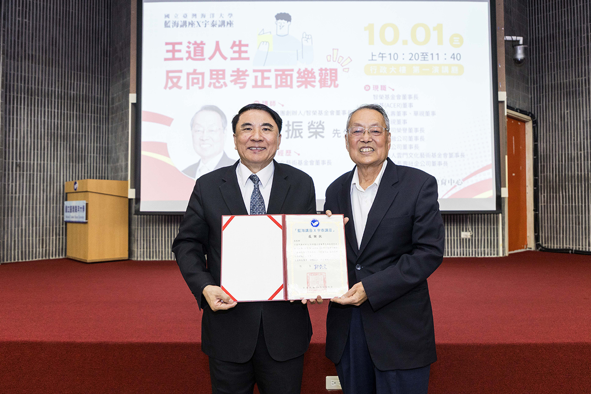 國立臺灣海洋大學10月1日邀請到宏碁集團創辦人、智榮基金會董事長施振榮蒞校,以「王道人生 反向思考 正面樂觀」為題發表演講,分享半世紀以來的創業智慧與人生哲學。他表示,王道是大小組織領導之道,他勉勵學子要持續學習、勇於接受挑戰,並以反向思考突破盲點,以正面樂觀面對困境,才能在成長道路上不斷精進。講座吸引眾多師生參與,現場座無虛席。