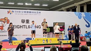 114年全運會「舉重女神」郭婞淳及黃品勳分為台東代表隊奮力舉起一金