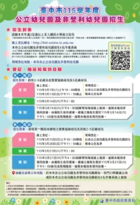 中市公共化幼兒園3/7起招生登記 115學年度開放在園生兄弟姊妹、現役軍人子女優先登記報名