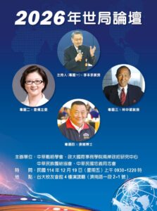 中華戰略學會「2026年世局論壇」研討會19日登場 李本京、雷倩、林中斌、張競發表專題演講