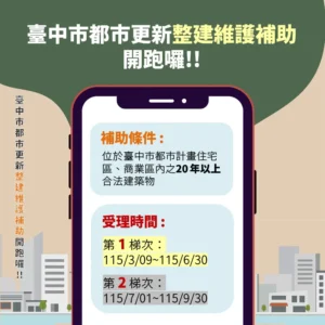 115年度「台中市都市更新整建維護補助」 即日起開始受理 歡迎民眾踴躍申請