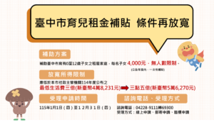 台中市育兒租金補貼放寬所得限制 擴大照顧育兒家庭