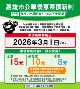 高雄市區公車優惠票價新制3月起上路 學生票、社福配套與TPASS不受影響
